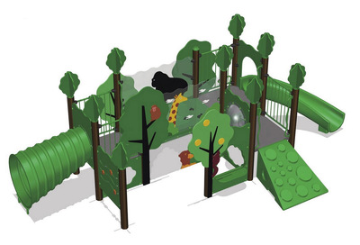 森に隠れる動物たちを探しながら、みんなで一緒に遊ぼう!がコンセプト。遊具の中をぐるぐる遊び回れる「回廊構造」を取り入れた固定大型遊具。森をイメージしているので、子ども達は森の中を探検しているように想像力を膨らませて遊びます。また、滑り台の出入口には静電気防止装置が組み込まれています。遊具の外から必ず体の一部が見えるように安全柵になどしており、視認性を考慮した管理面にも易しいデザインを採用しています。